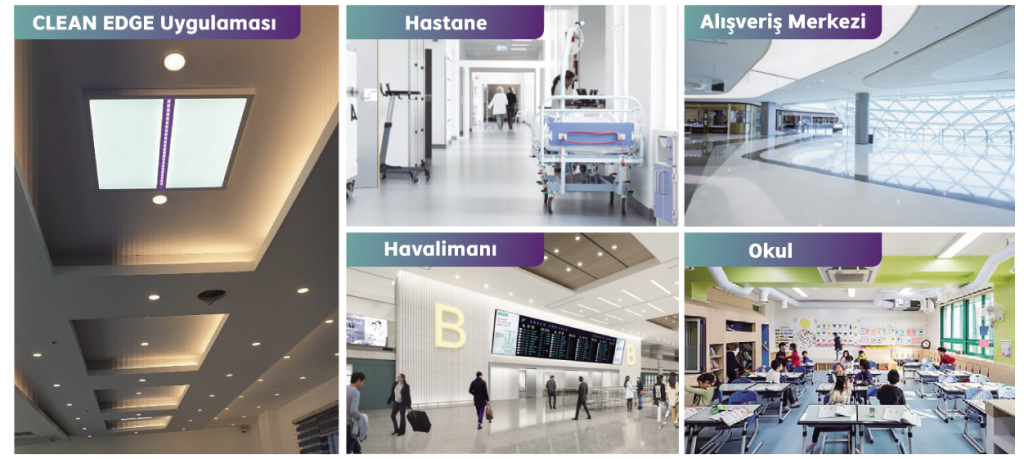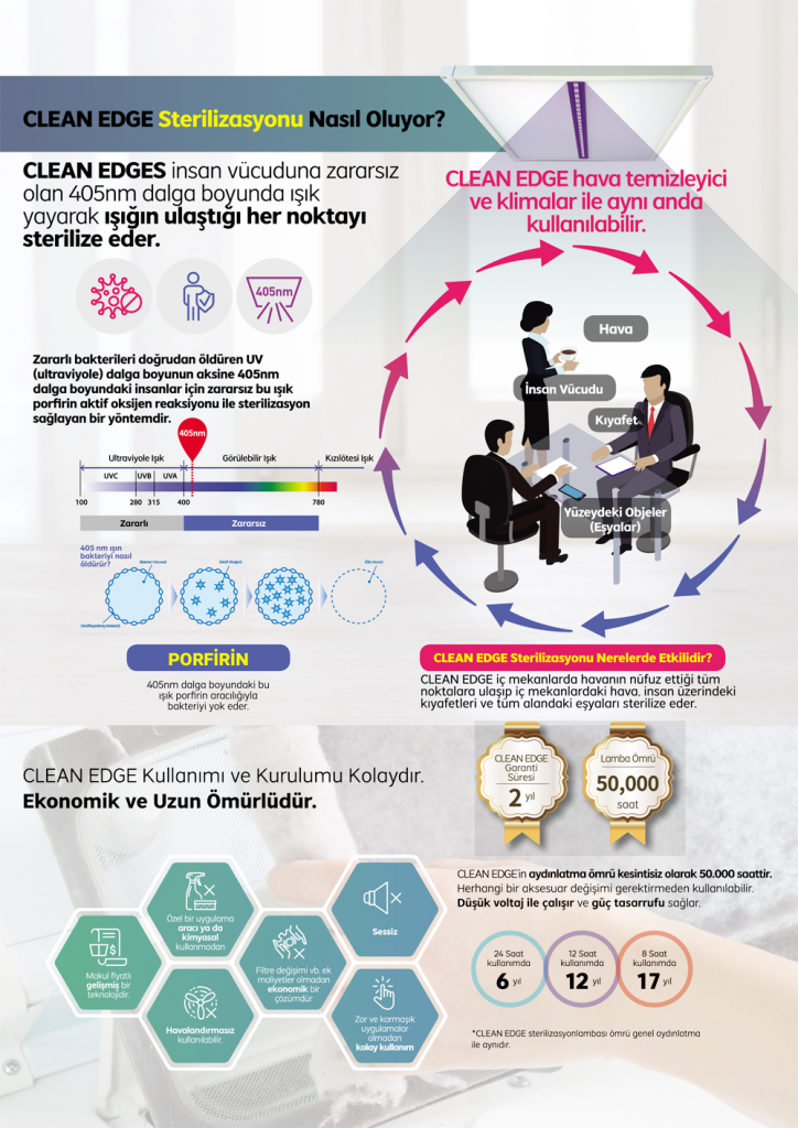 CleanEdge Led Aydınlatması, 405nm dalga boyunda mavi mor ışık ile insan sağlığına zarar vermeden 7/24 dezenfeksiyon sağlayan Güney Kore’de üretilen son teknoloji ürünüdür.