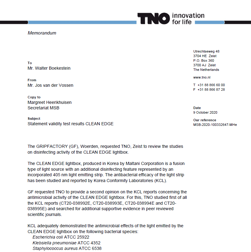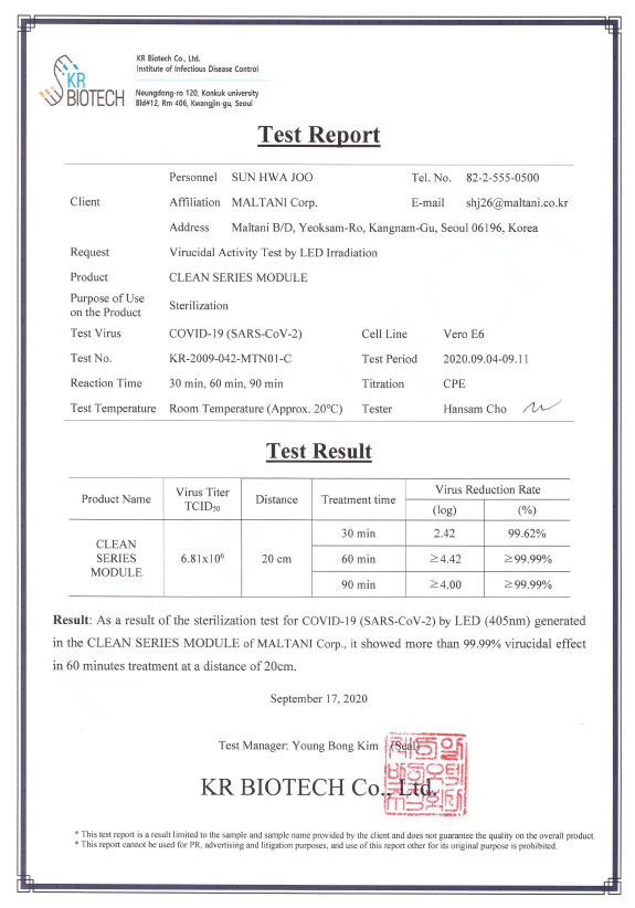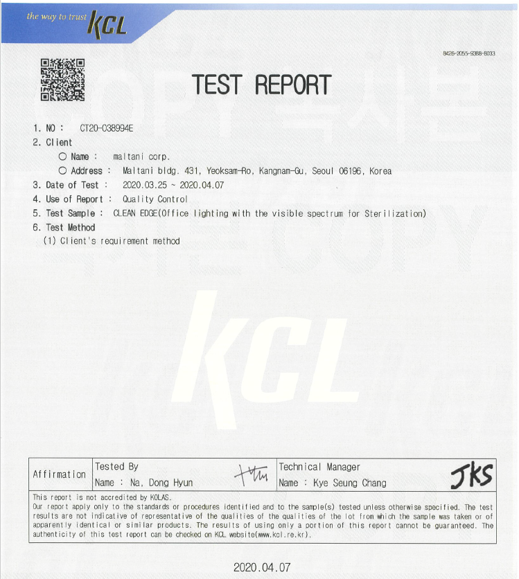 Değerli müşterimiz ,aşağıda ki test raporları Clean Edge için çeşitli kurumlardan alınmış kullanım ve etkinlik onaylarıdır. Antimikrobiyal etkilerle ilgili Covid 19 ilk rapor 20cm test Covid 19 ikinci test 50 cm test Covid 19 testi 2020 MRSA Staphylococcus aureus subsp.aureus ATCC 33591 Staphylococcus aureus ATCC Escheriachia coli ATCC 25922 Klebsiella pneumoniae ATCC MRSA Staphylococcus aureus subsp.aureus ATCC 33591 KR21-HEC0029_Maltani_S-RLP3040-50-C001(진) (2) KR21-HEC0030_Maltani_S-RLP3040-50-C002(진) (2)
